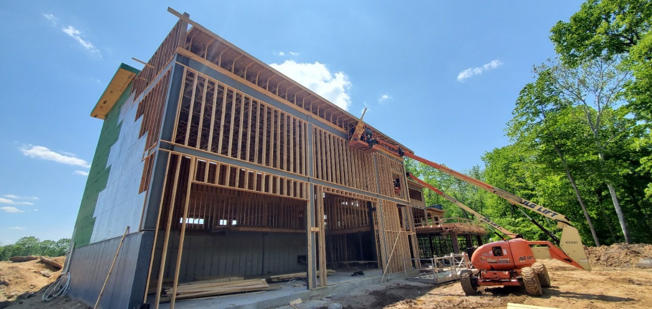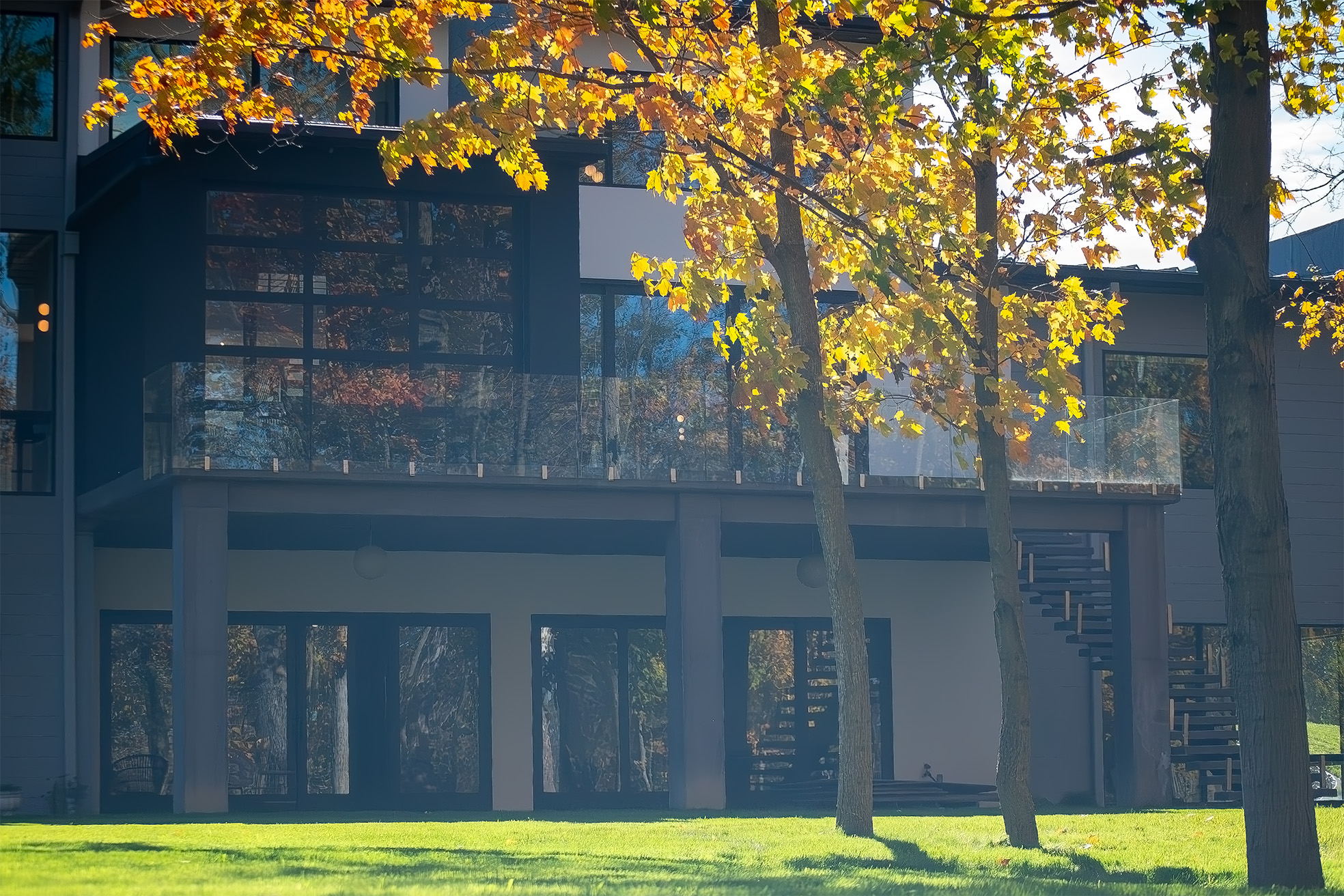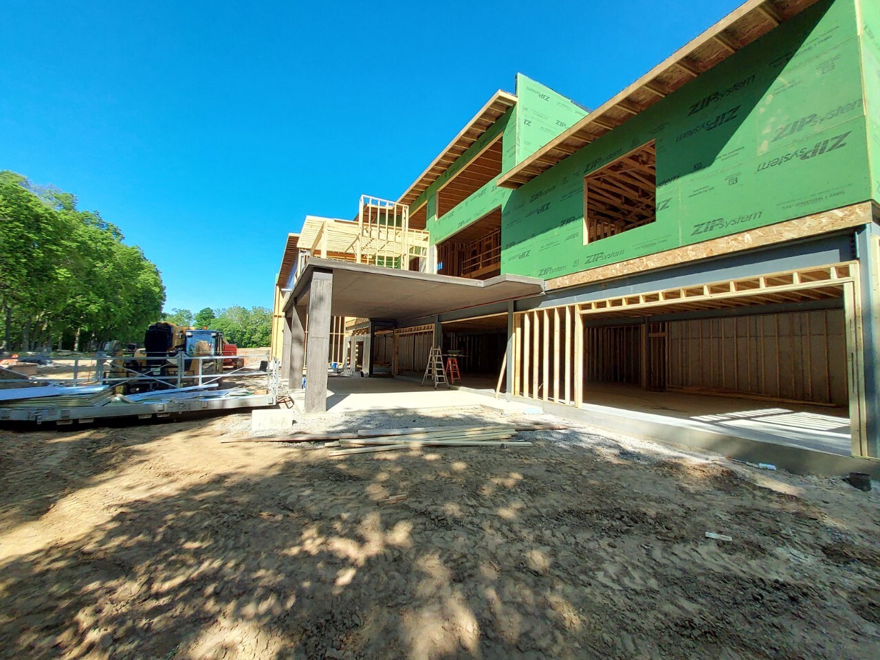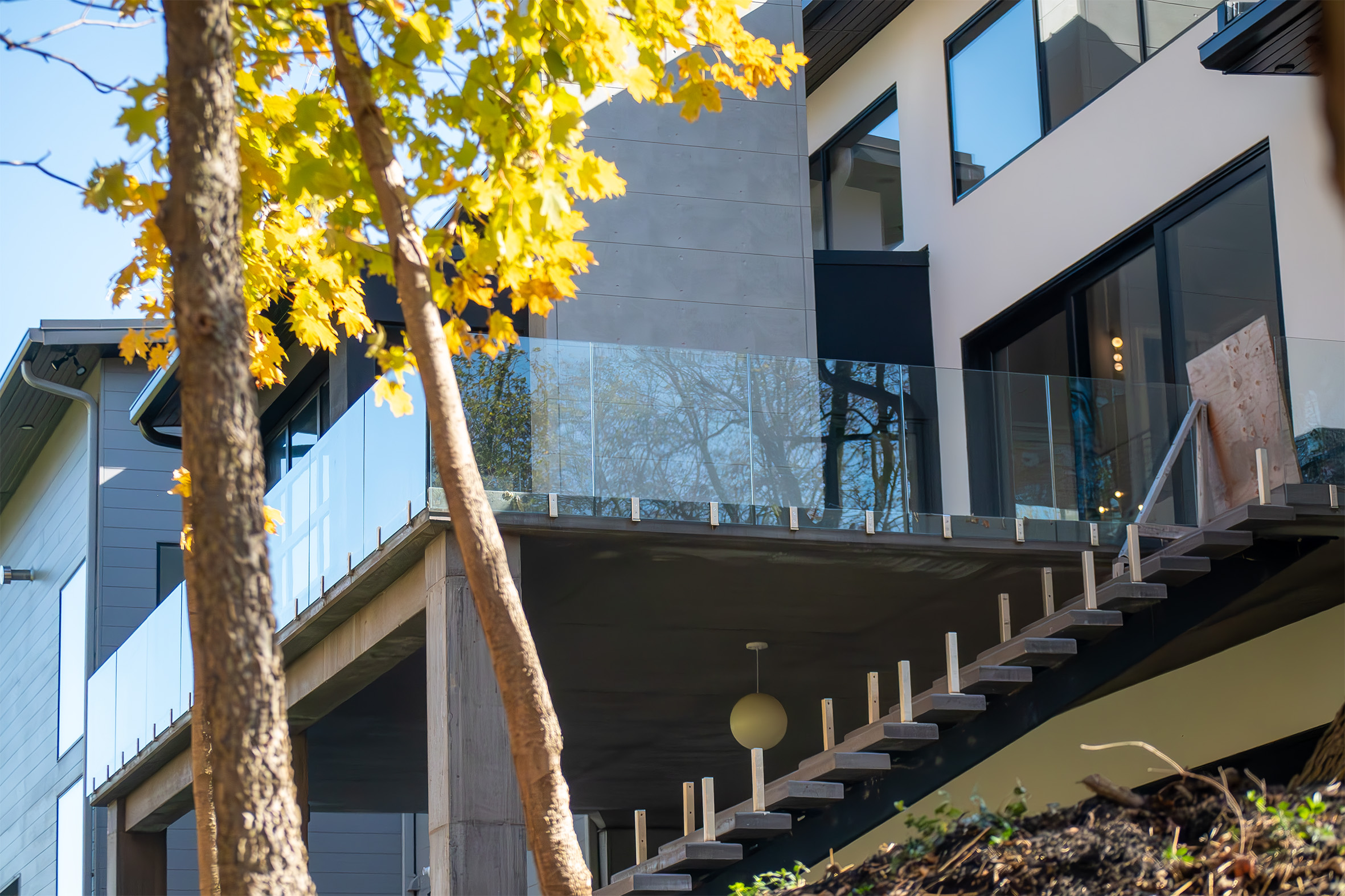 • Second-floor balcony spans 40 feet free without posts, using engineered LVLs and a cantilevered design.