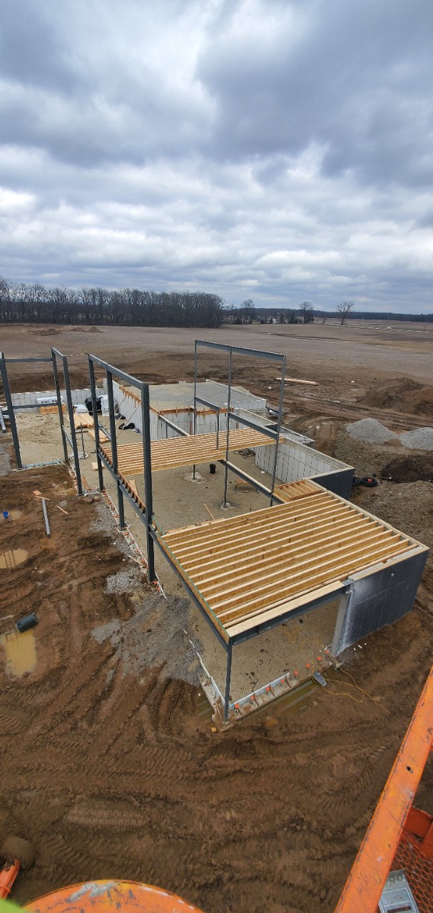 • Steel columns support an 8-inch thick double-reinforced concrete deck, with 3 exterior concrete columns.