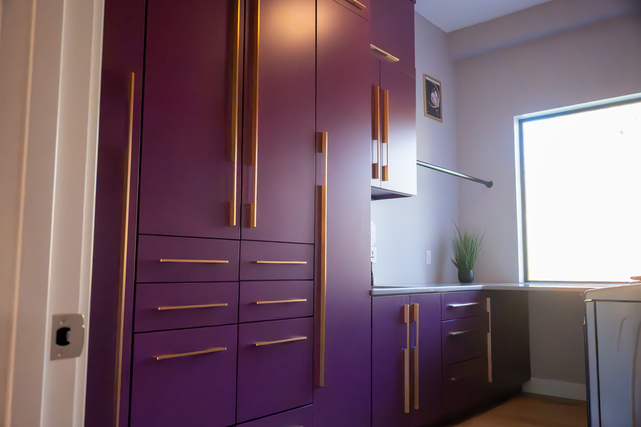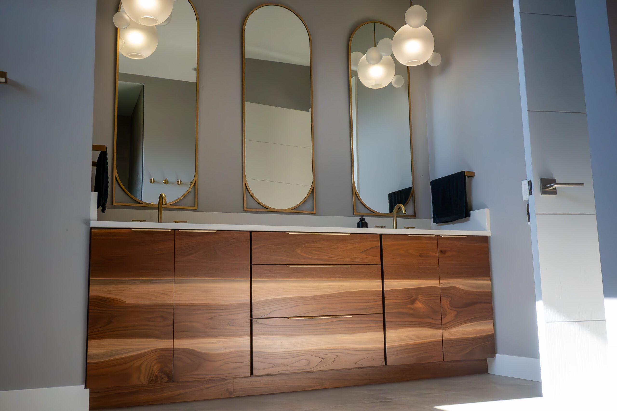 • Custom cabinetry made from a single log with continuous wood grain across drawers.