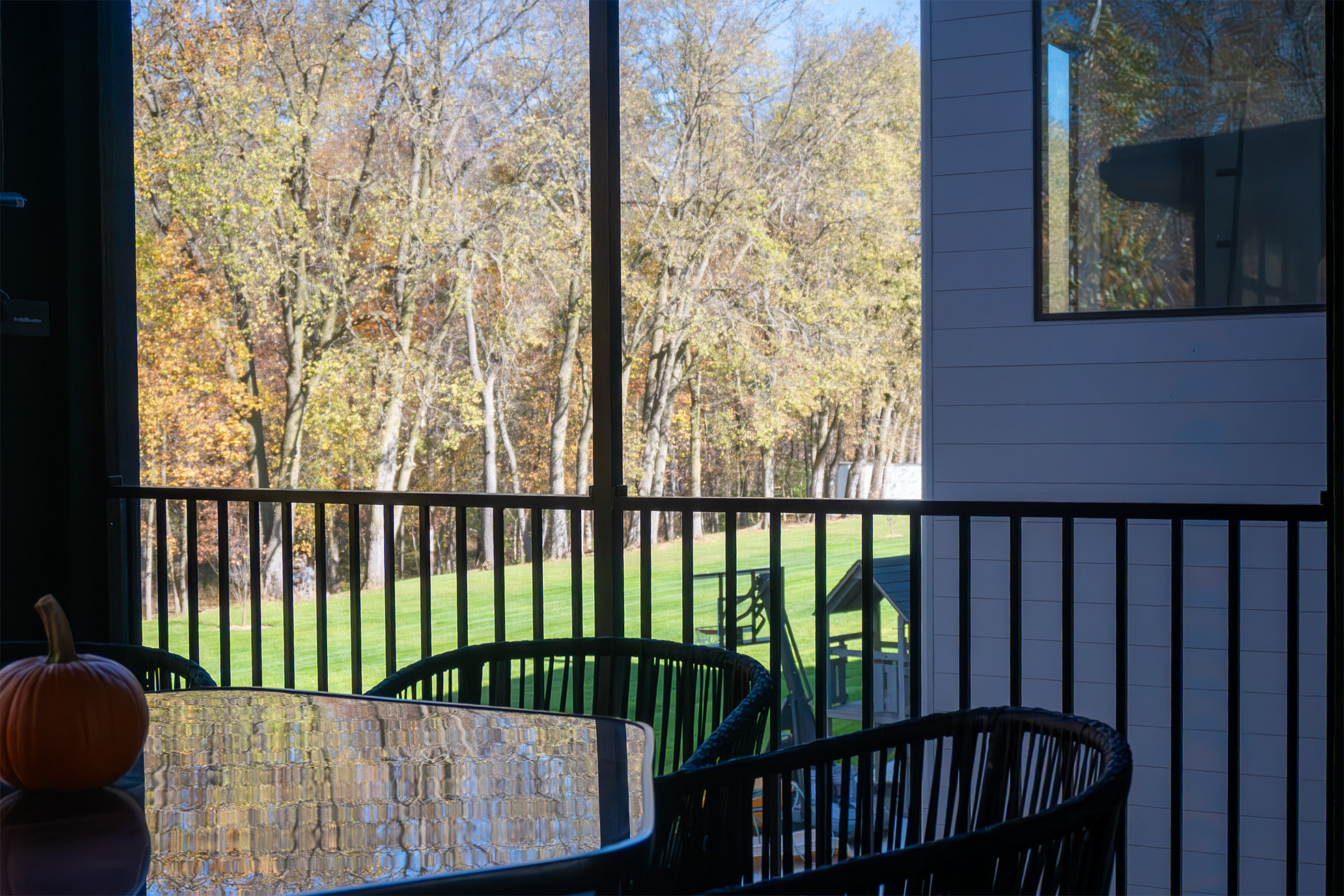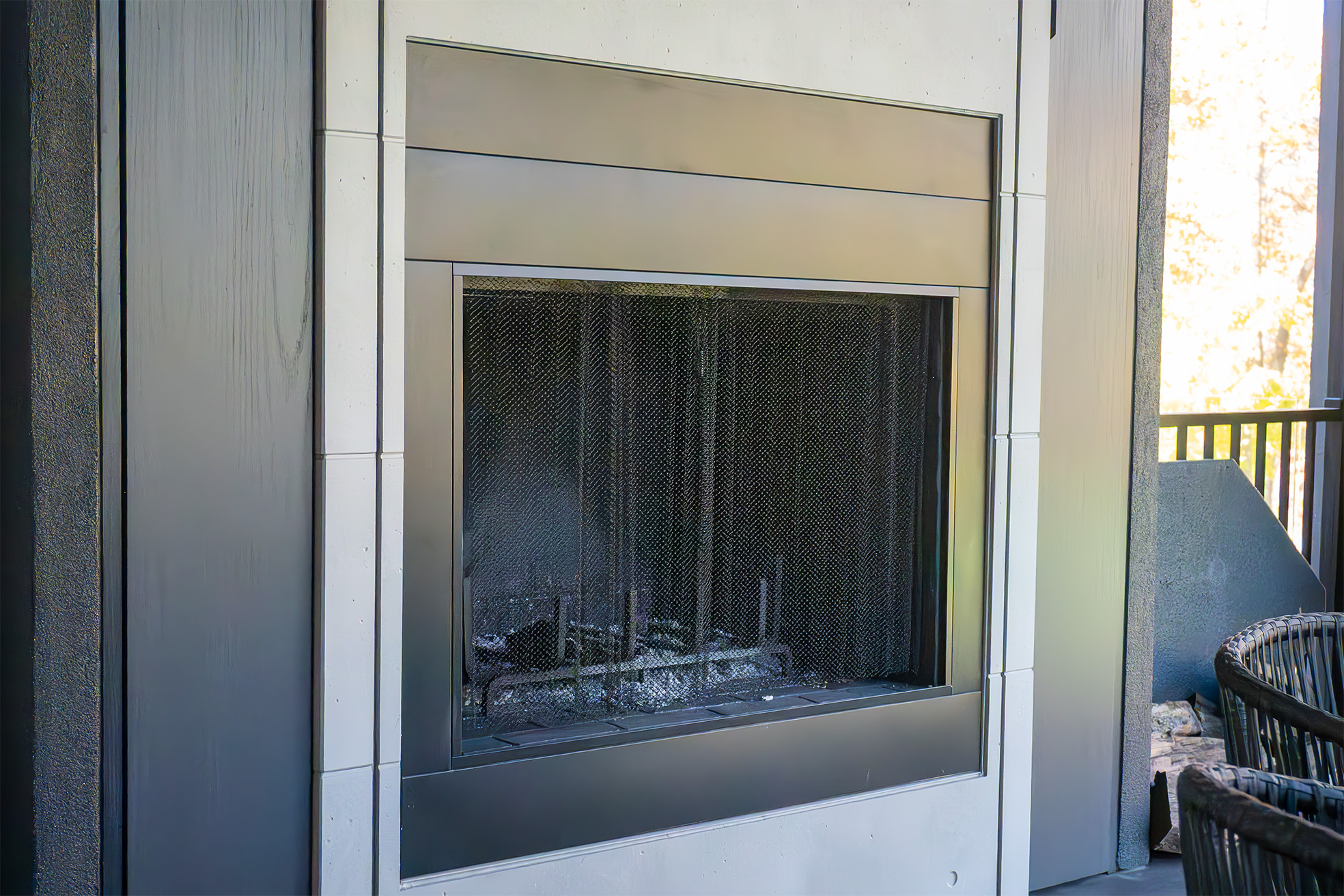 • Outdoor screen room with a glass garage door and concealed wood-burning fireplace for clean aesthetics.