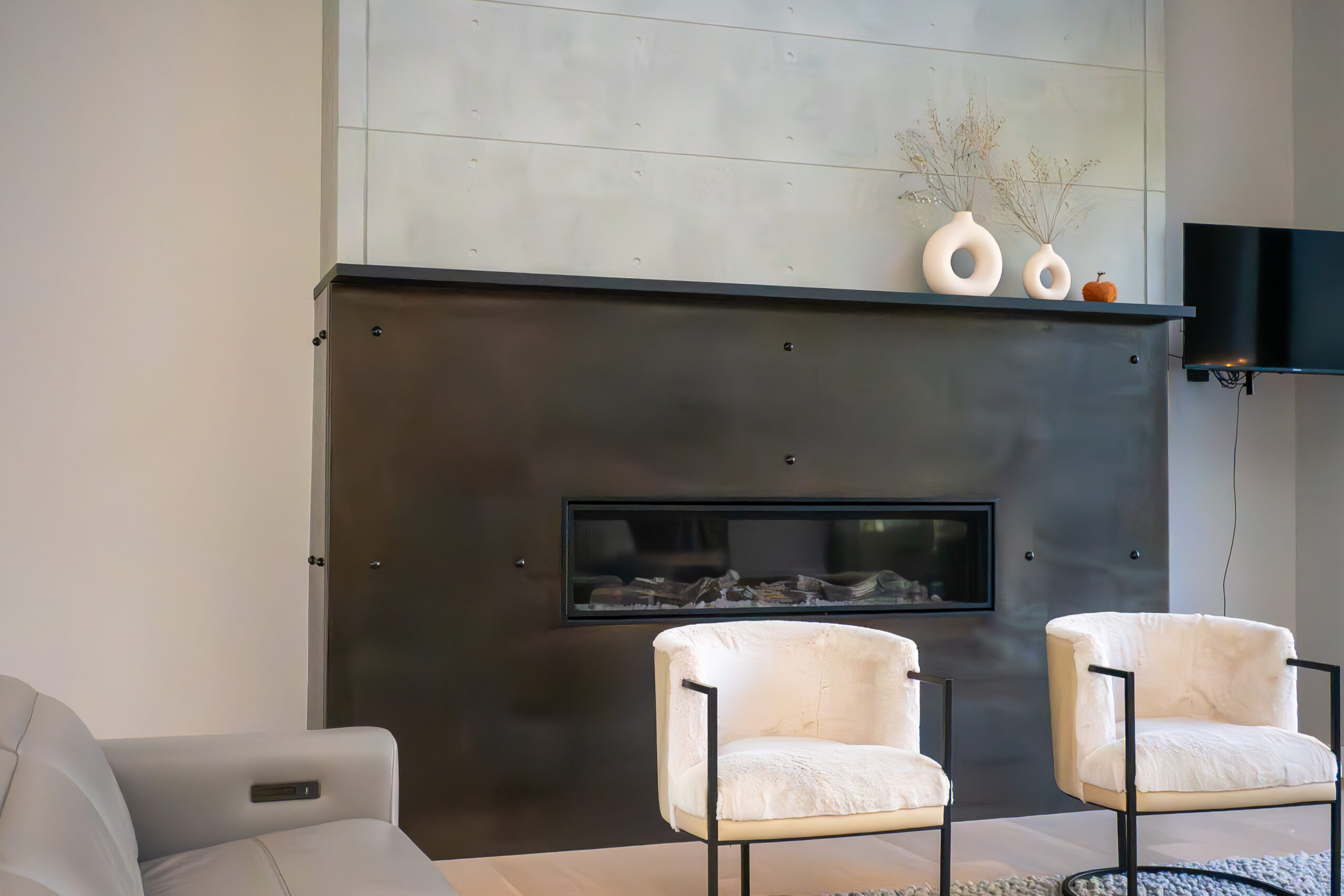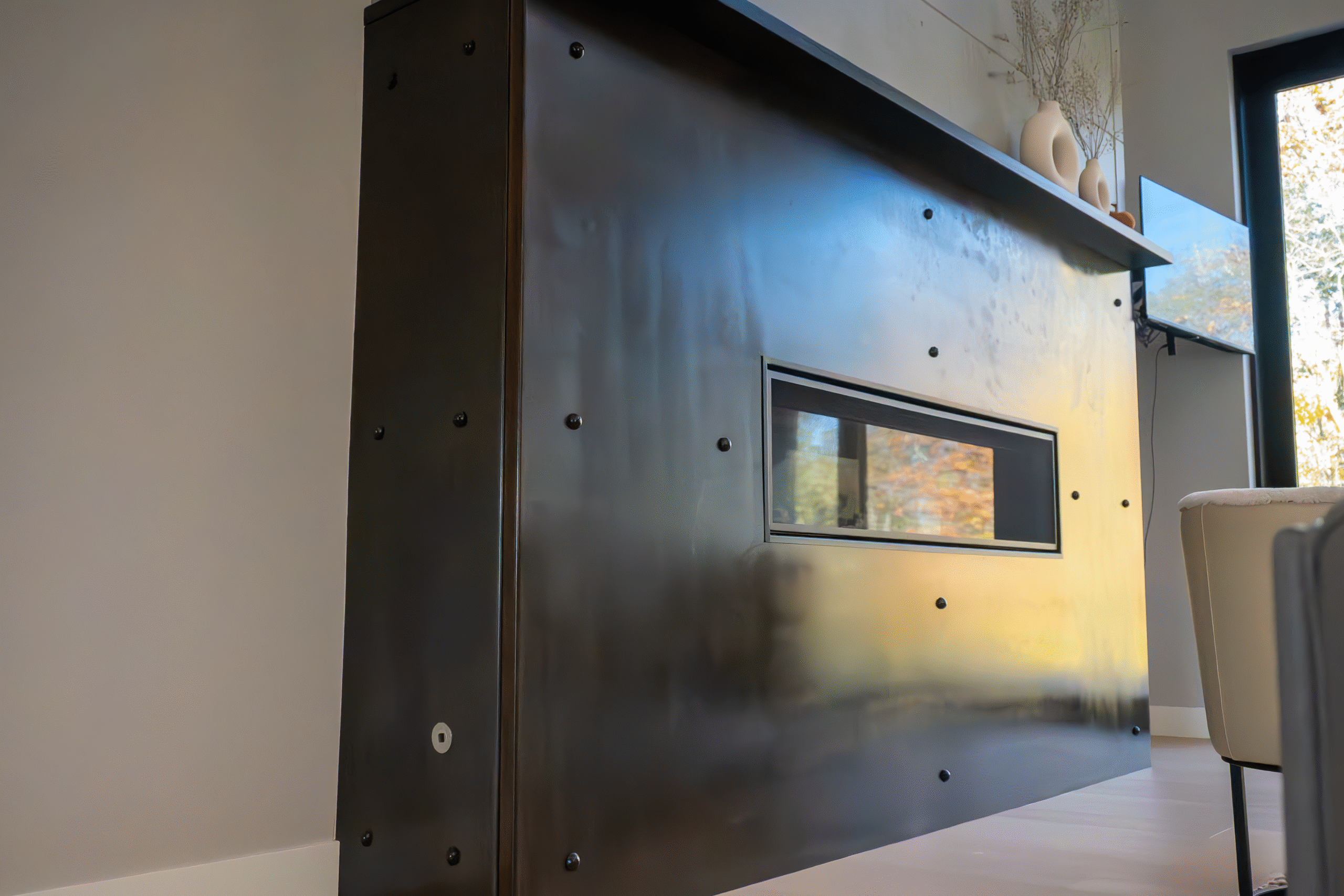 Inside, creativity thrives. One bedroom became an underwater escape with glossy ceilings and ocean hues, while walnut steps—crafted from trees on-site—connect floors with a story of sustainability and heritage. Even the fireplace tells a tale: its blackened steel and riveted design echo the resilience of ships that conquer storms.