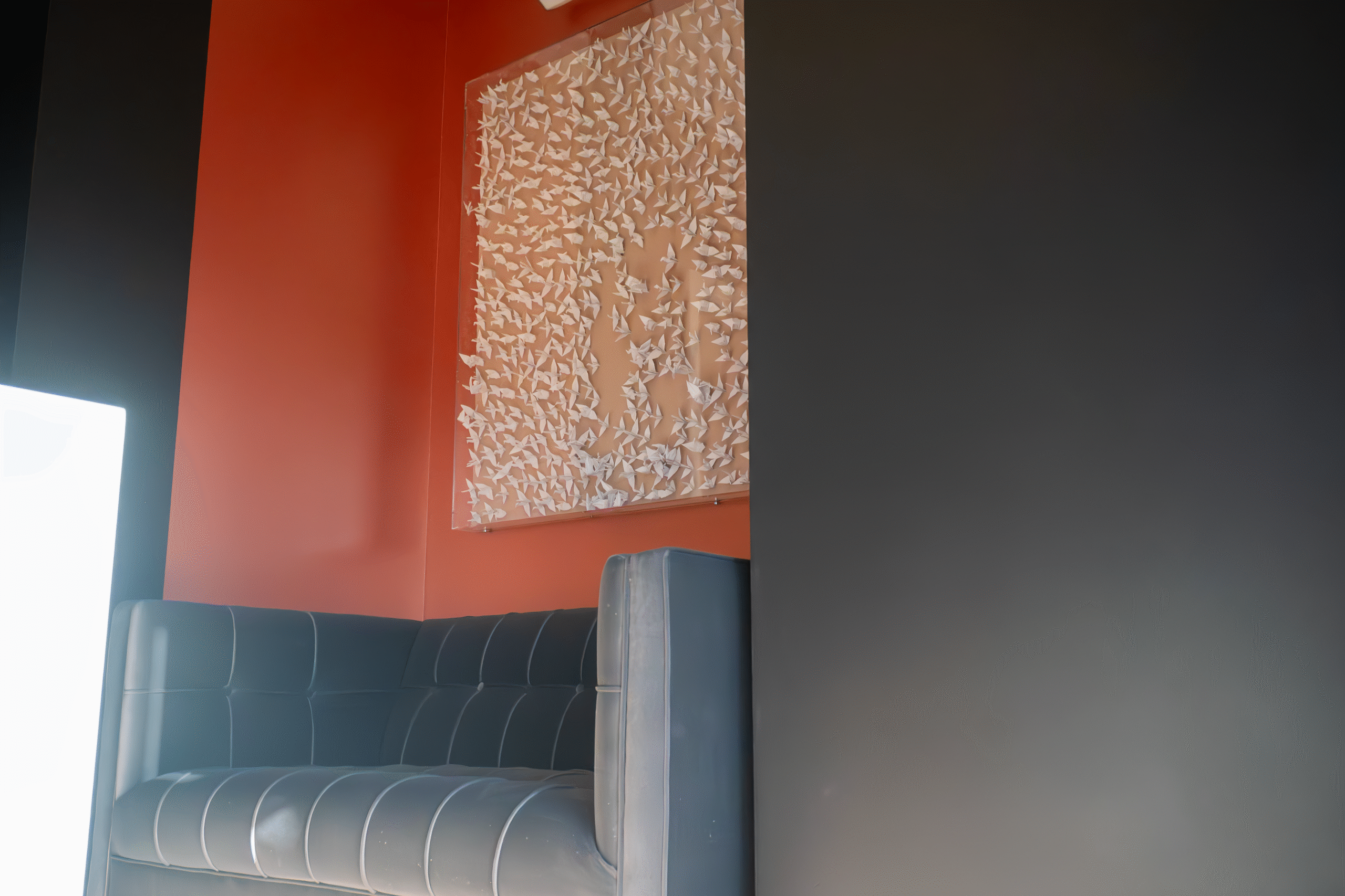 • Aquarium-inspired bedroom with high-gloss ceiling and blue walls.